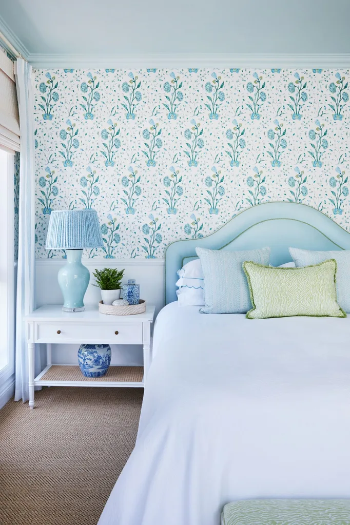 “We wanted classic interiors, but creative and playful and pretty,” she says. A core palette of coastal blues is expressed through bright cerulean cabinetry, patterned fabrics and wallpapers, offset by crisp whites and touches of sand. Branching out from blue, each bedroom is themed by colour (green, pink, aqua), while the bathrooms are each defined by beautiful wallcoverings, adding warmth – a signature feature of Melinda’s style.