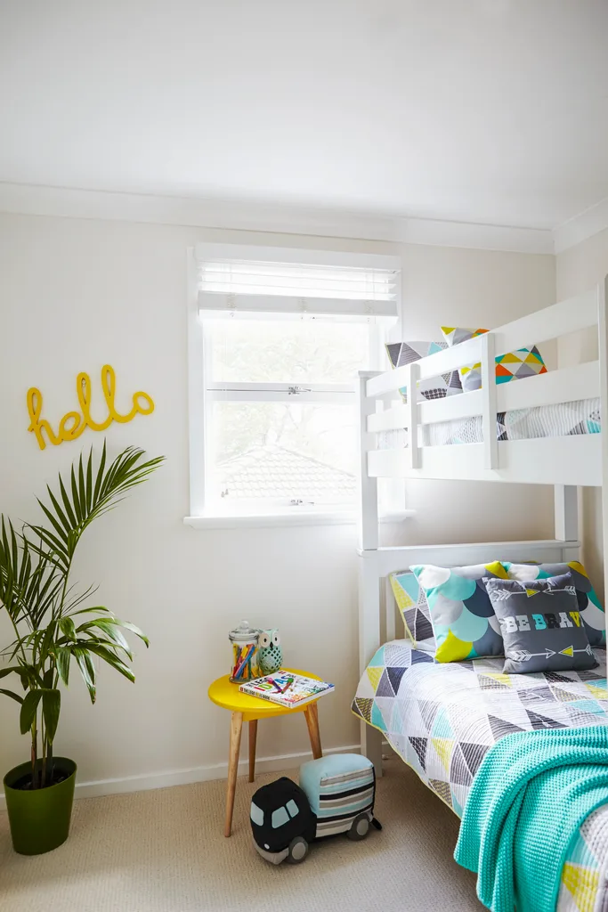 Splashes of yellow and turquoise give the eldest boys’ room a mature but light-hearted feel. The graphic-look bedlinen, throw rug and yellow table are all from Adairs.