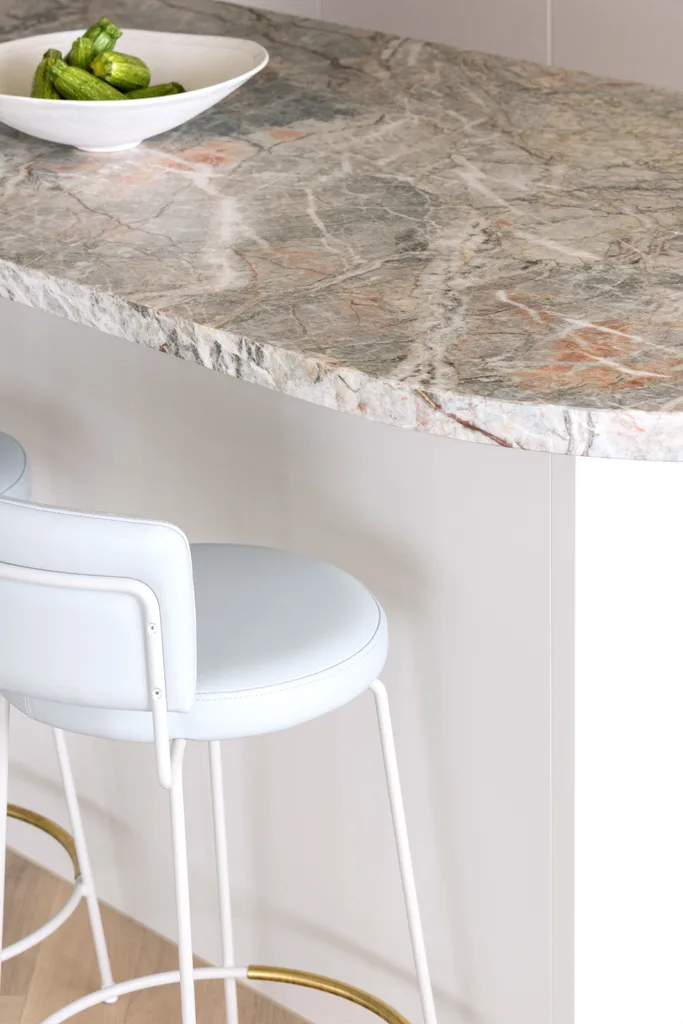 Creating curved walls and sourcing a specific marble for the kitchen were lofty goals, but the result is a triumph and the couple are grateful for the tradespeople who made it happen. “It’s so elegant, light and airy,” says Rose. “It fits in perfectly with the water views.”