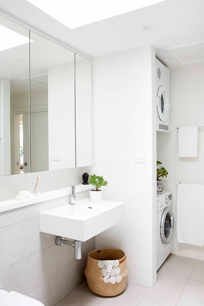 Simple white fixtures and a subtle palette of tiles, plus a wall-wide mirrored cabinet, makes the combined bathroom and laundry feel larger.