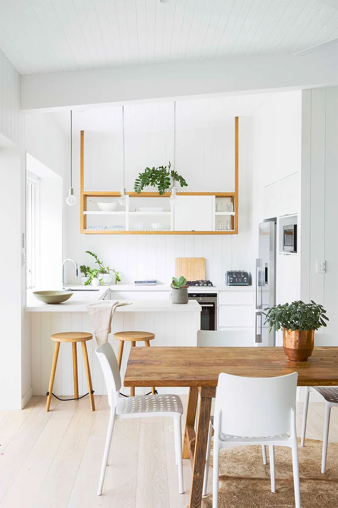 French oak floorboards and VJ wall panels in Dulux Natural White complete the former shed’s transformation.
