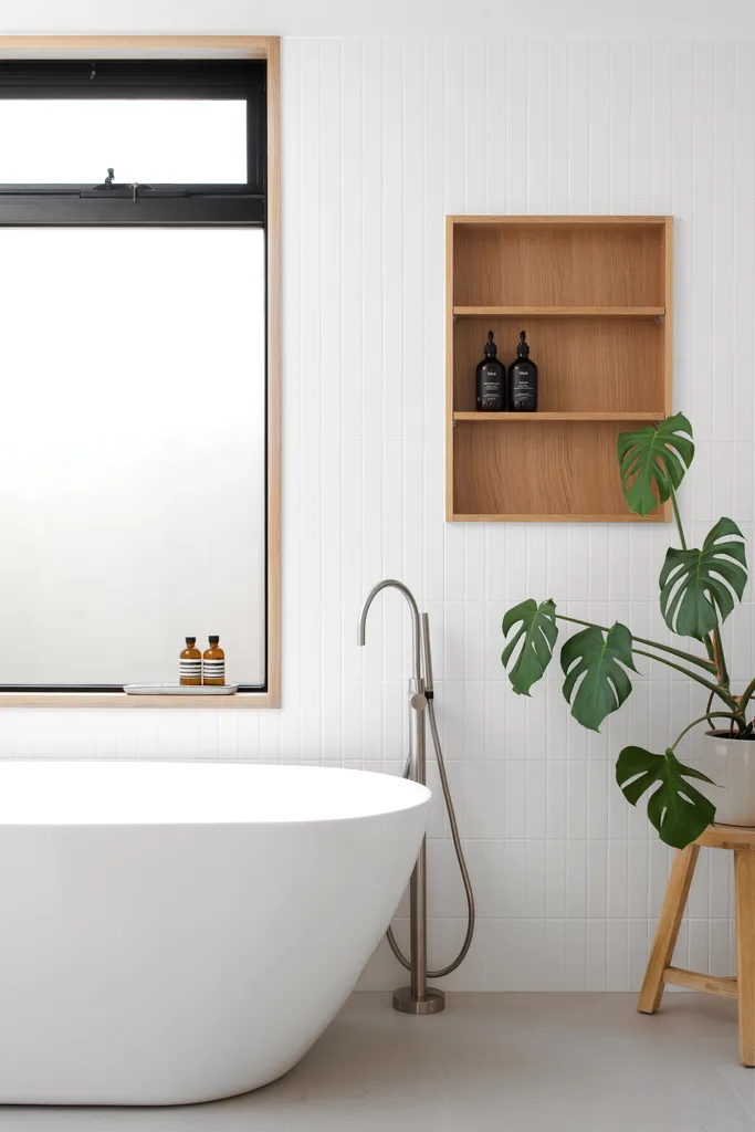 A handy American Oak veneer cabinet is set within the bathroom, wall-tiled with ‘Barcelona’ tiles from Beaumont Tiles. The family can relax in the deep Kado ‘Lux’ oval bathtub from Reece, with a ‘Vivid Slimline’ floor mixer from Phoenix Tapware in easy reach.