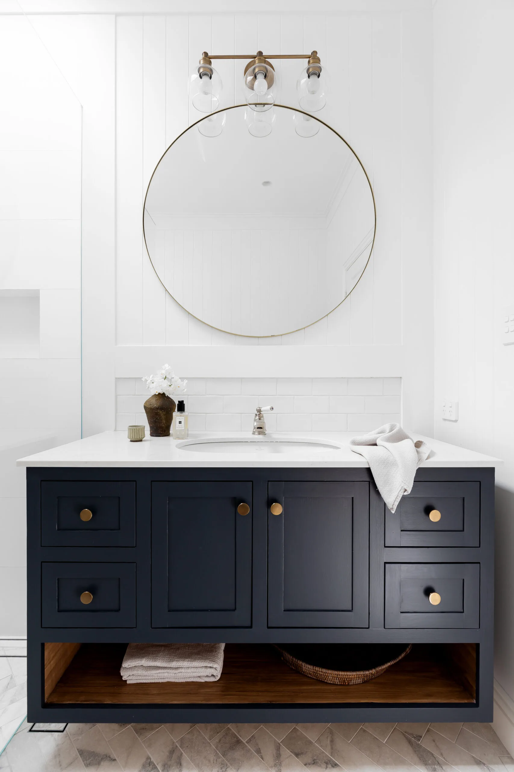 While the bathroom very much fits the serene Hamptons aesthetic the couple were going for, it also includes country bathroom touches like ‘Hardie Groove’ VJ lining boards and joinery in Dulux Sea Breeze Half. A ‘Zeta’ mirror from Café Lighting & Living sits above Faucet Strommen ‘Cascade’ tapware from Bathroom Collective.