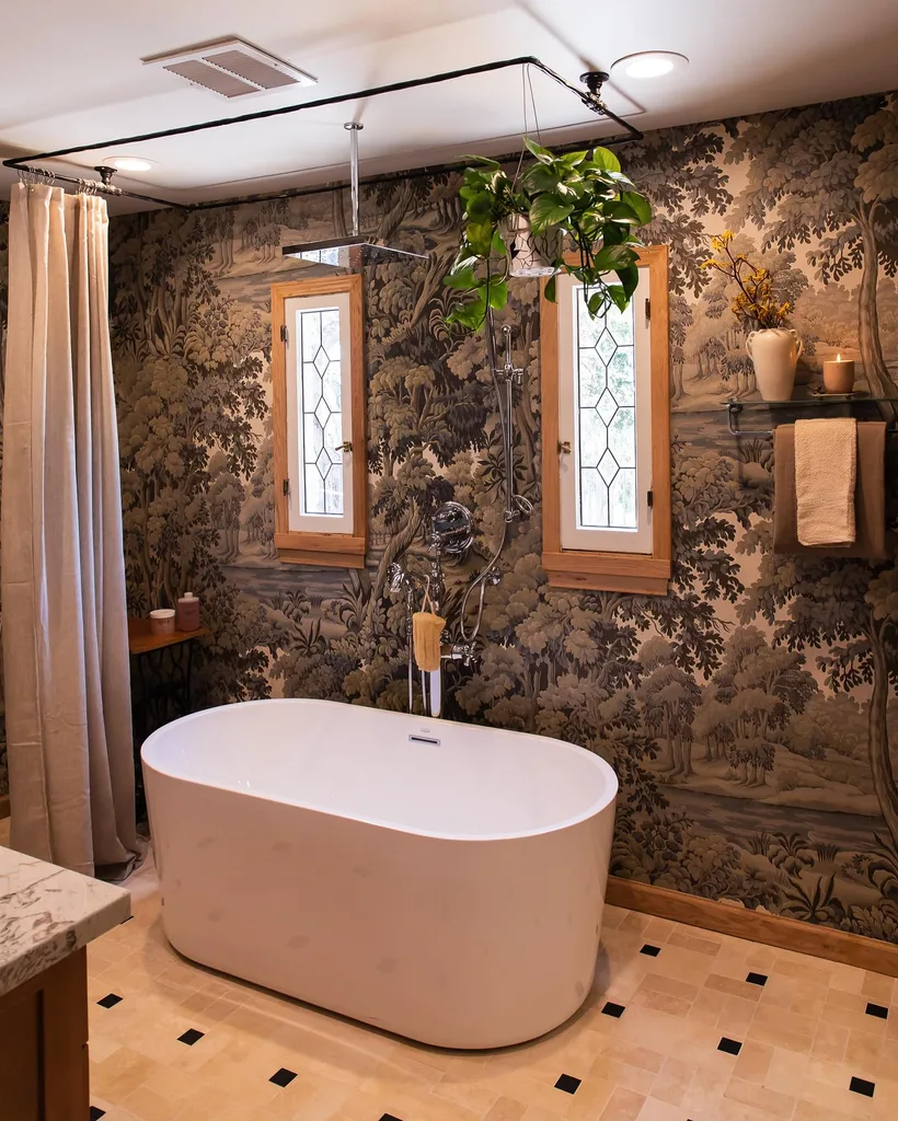 Plants are dotted throughout, in keeping with other earthy elements like raw wood and botanical wallpaper.