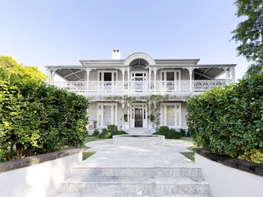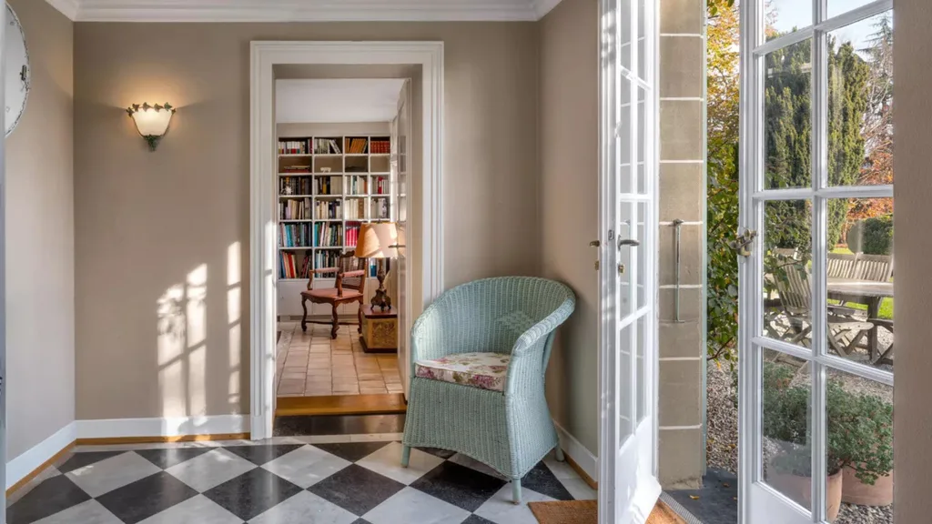 The home still retains plenty of character features, including checkerboard flooring and pretty French doors.